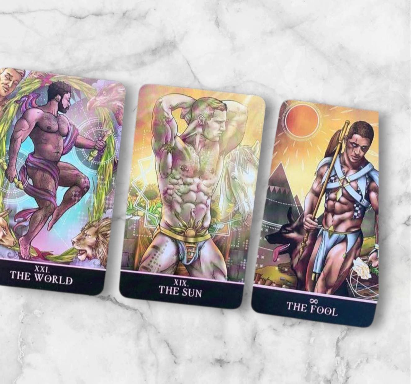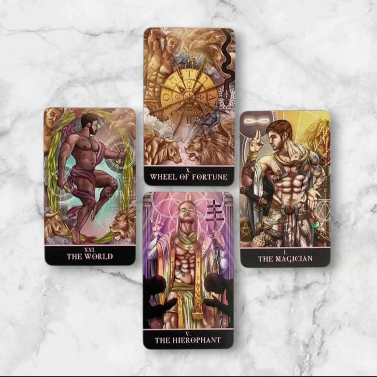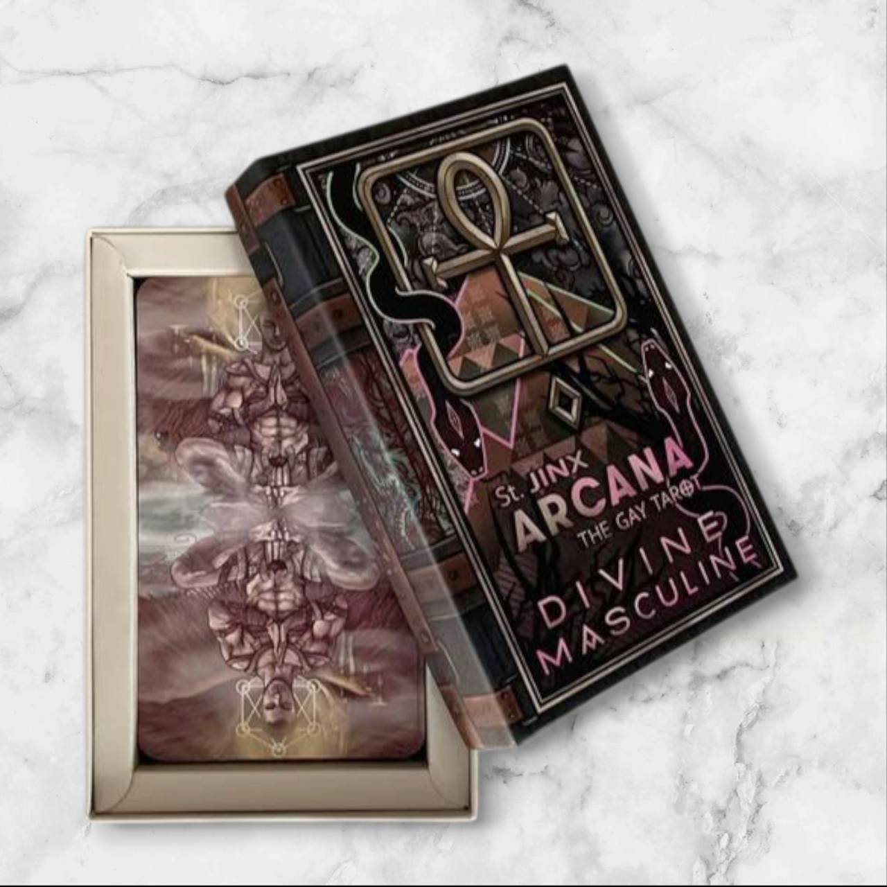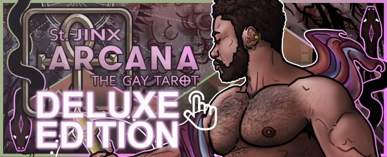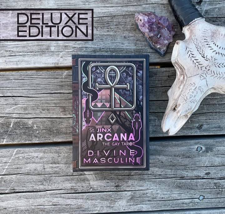 THE GAY TAROT (78 cards total) This is the updated BORDERLESS version of the Divine Masculine deck. The St. Jinx Arcana is a fully illustrated tarot deck, reimagined for the gay community. The characters and backgrounds feature abundant symbolism and attention to detail, with the imagery remaining similar to that found in the popular Rider-Waite-Smith Tarot.