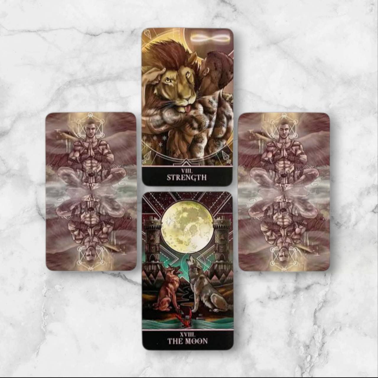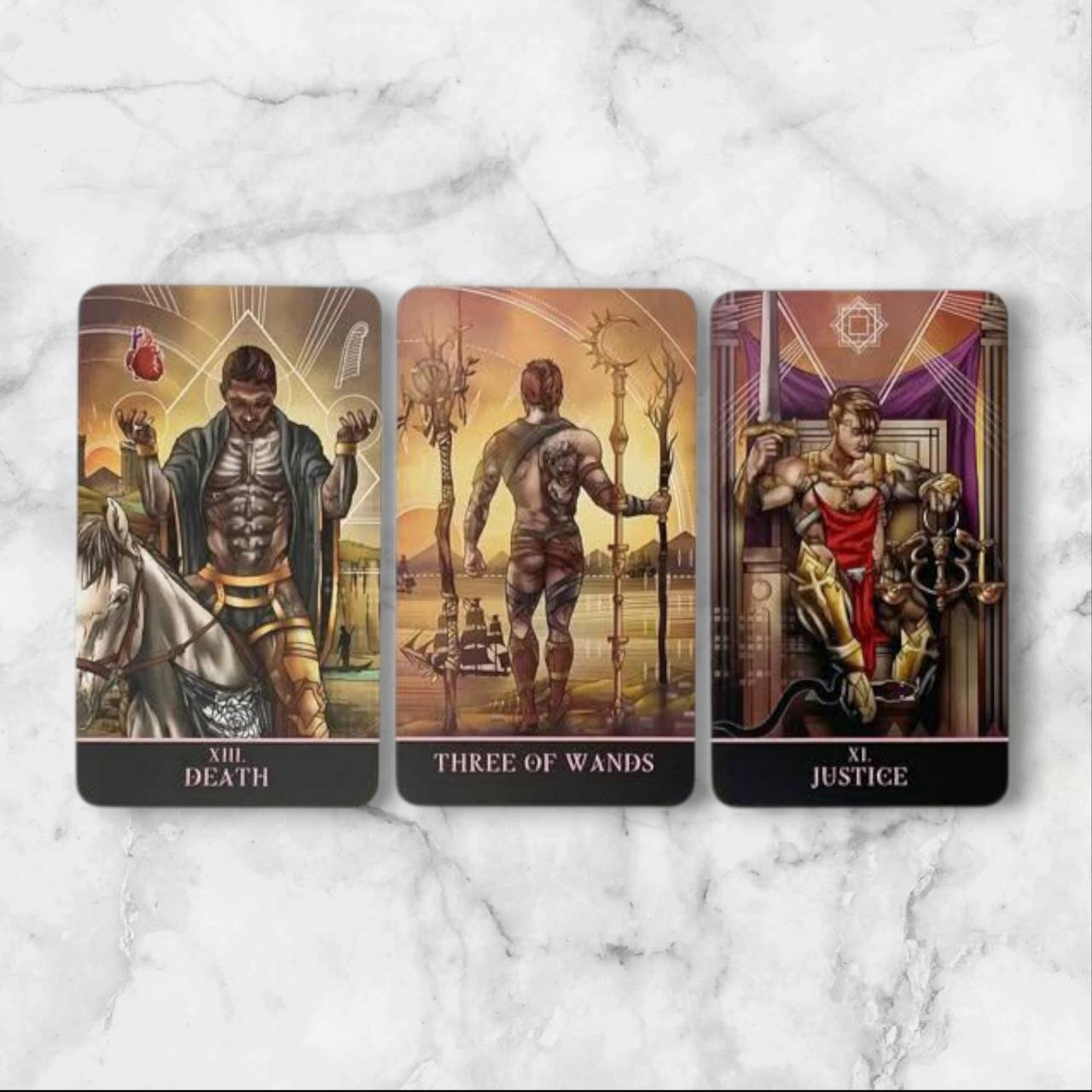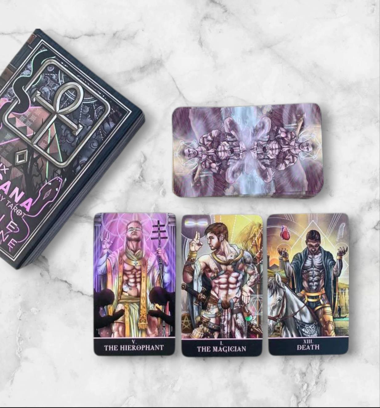 THE GAY TAROT (78 cards total) This is the updated BORDERLESS version of the Divine Masculine deck. The St. Jinx Arcana is a fully illustrated tarot deck, reimagined for the gay community. The characters and backgrounds feature abundant symbolism and attention to detail, with the imagery remaining similar to that found in the popular Rider-Waite-Smith Tarot.
