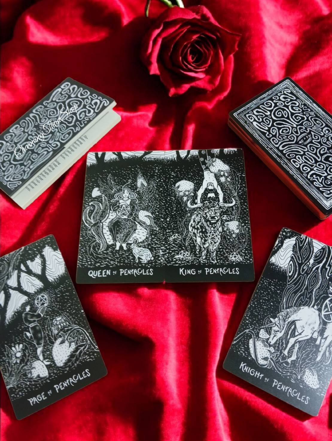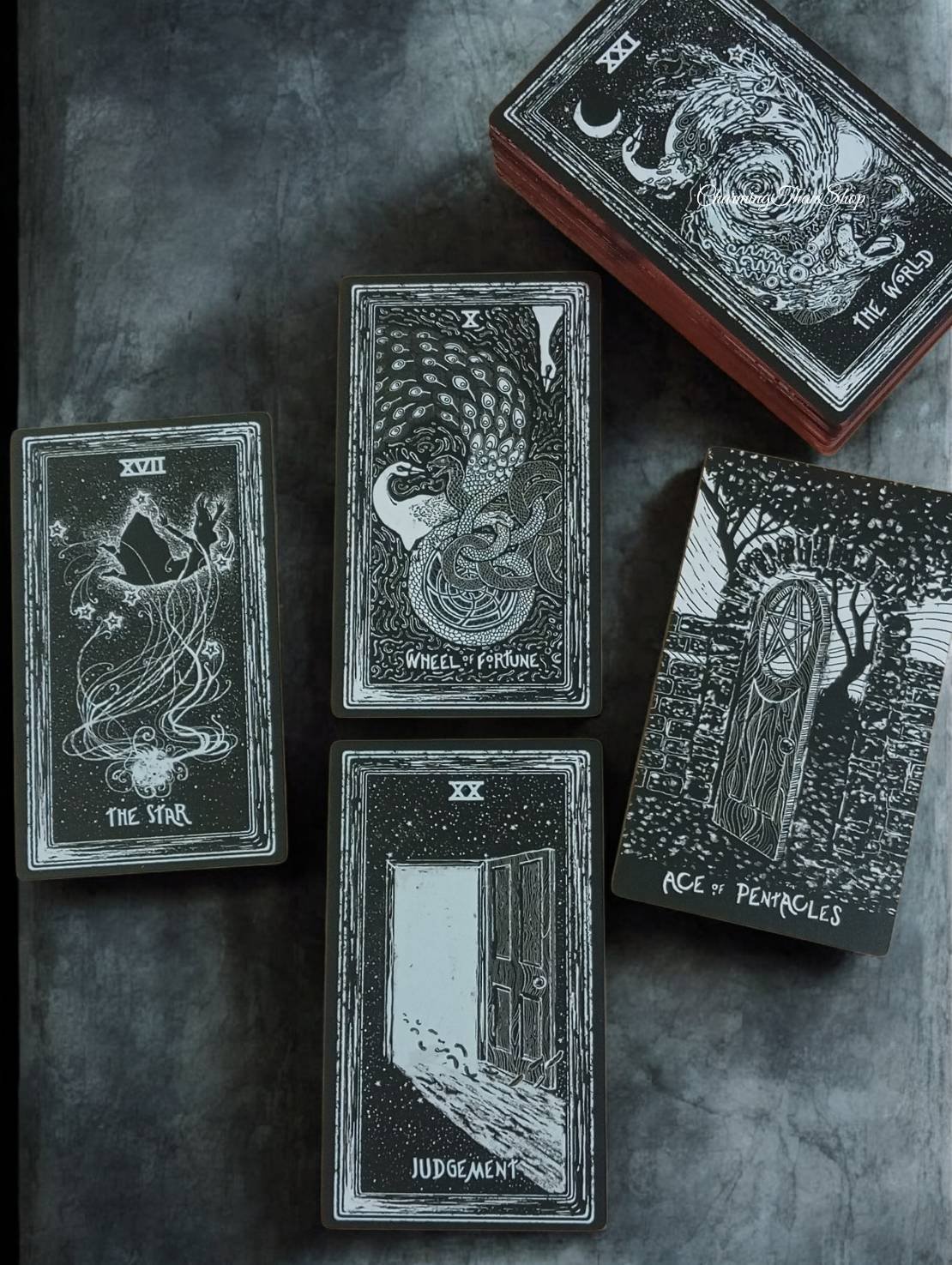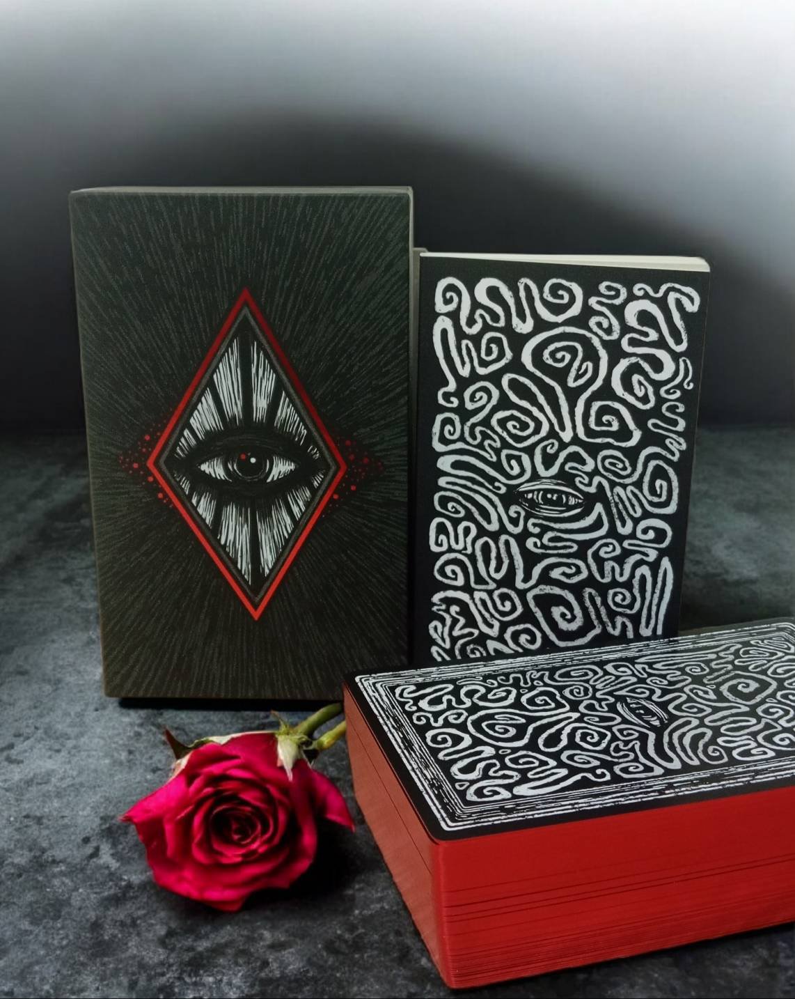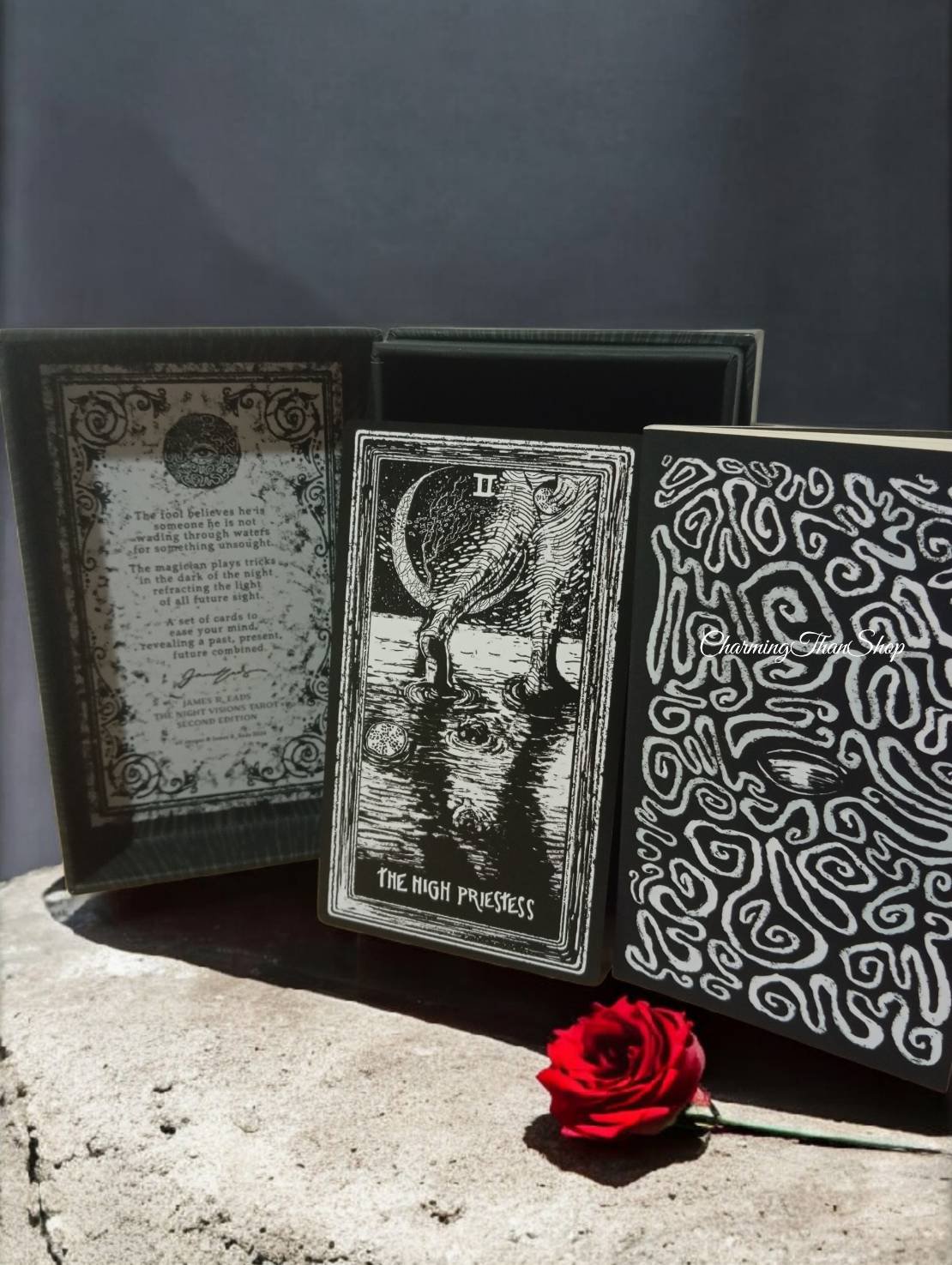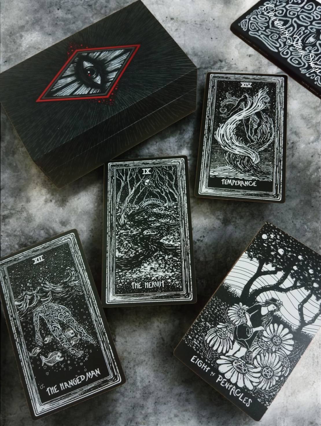 Night Visions Tarot is the dark sister of Light Visions, featuring metallic red foil accents on the 79th card and gilded edges throughout.