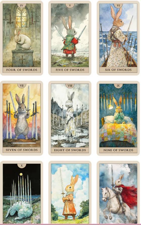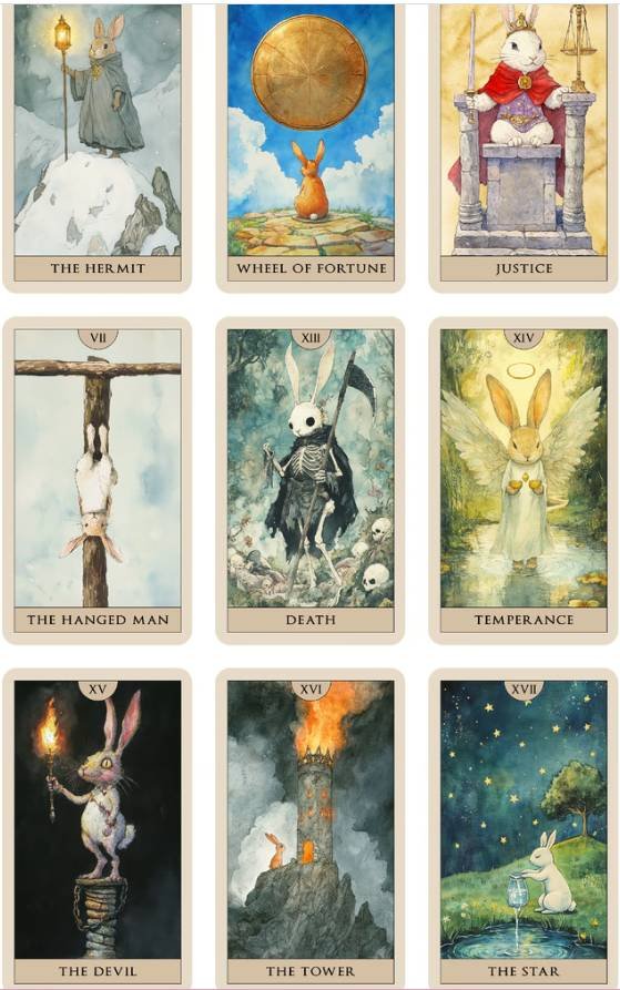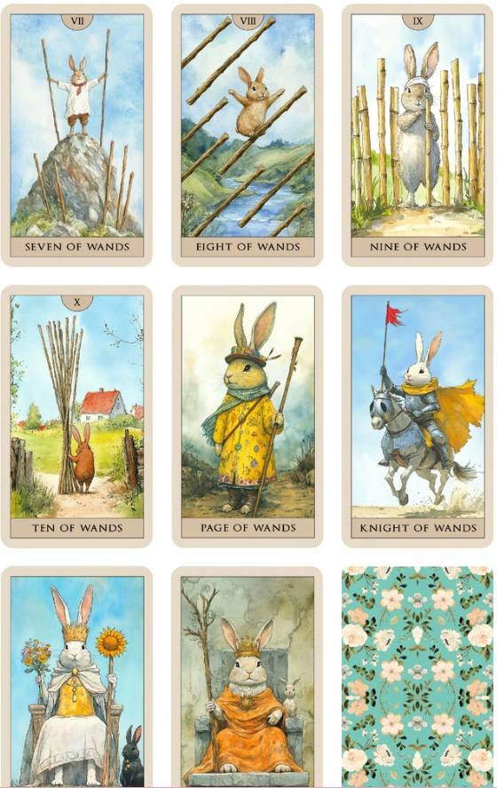 This tarot deck is rabbit-themed, blending elements of both rabbits and humans. The art style is watercolor-inspired, with fairy tale books as the main reference. Each tarot card showcases a unique rabbit character, each with their own personality, backstory, and symbolism.