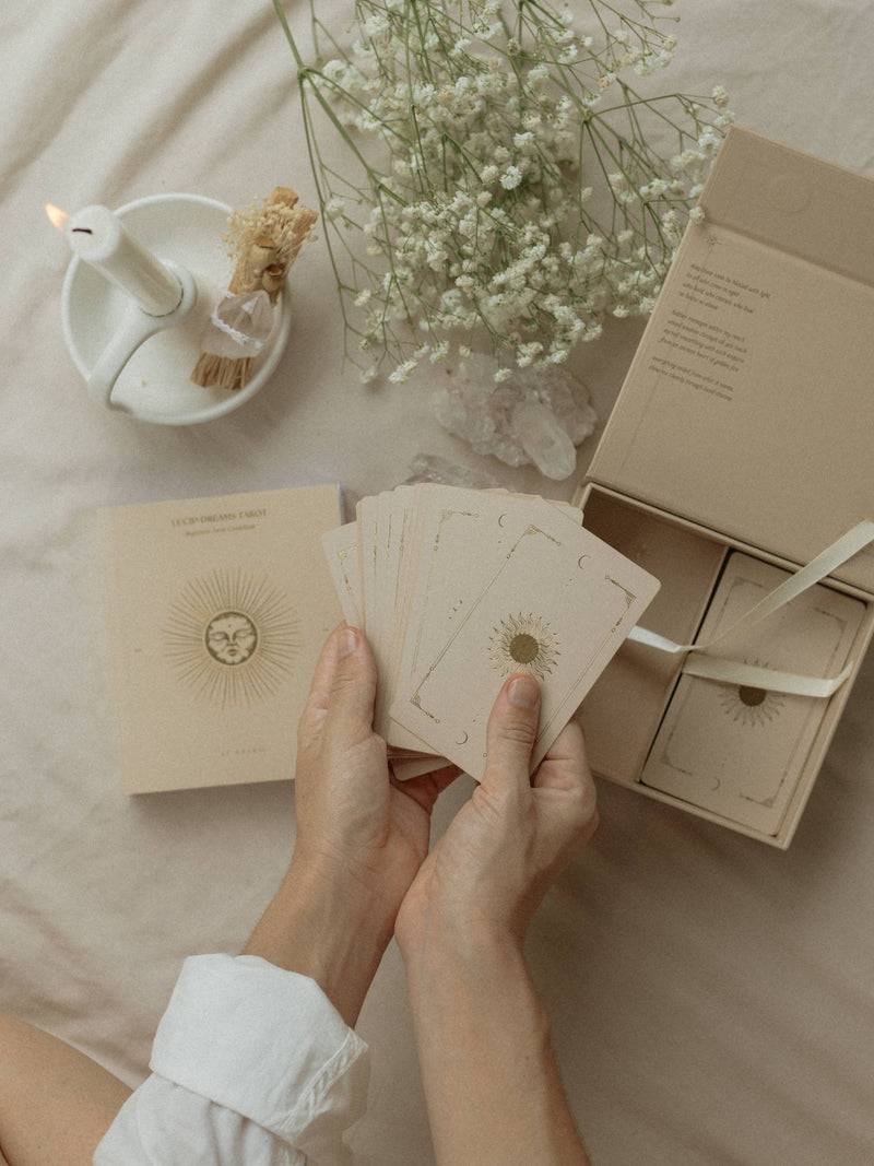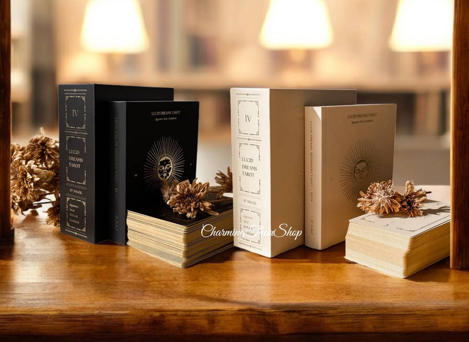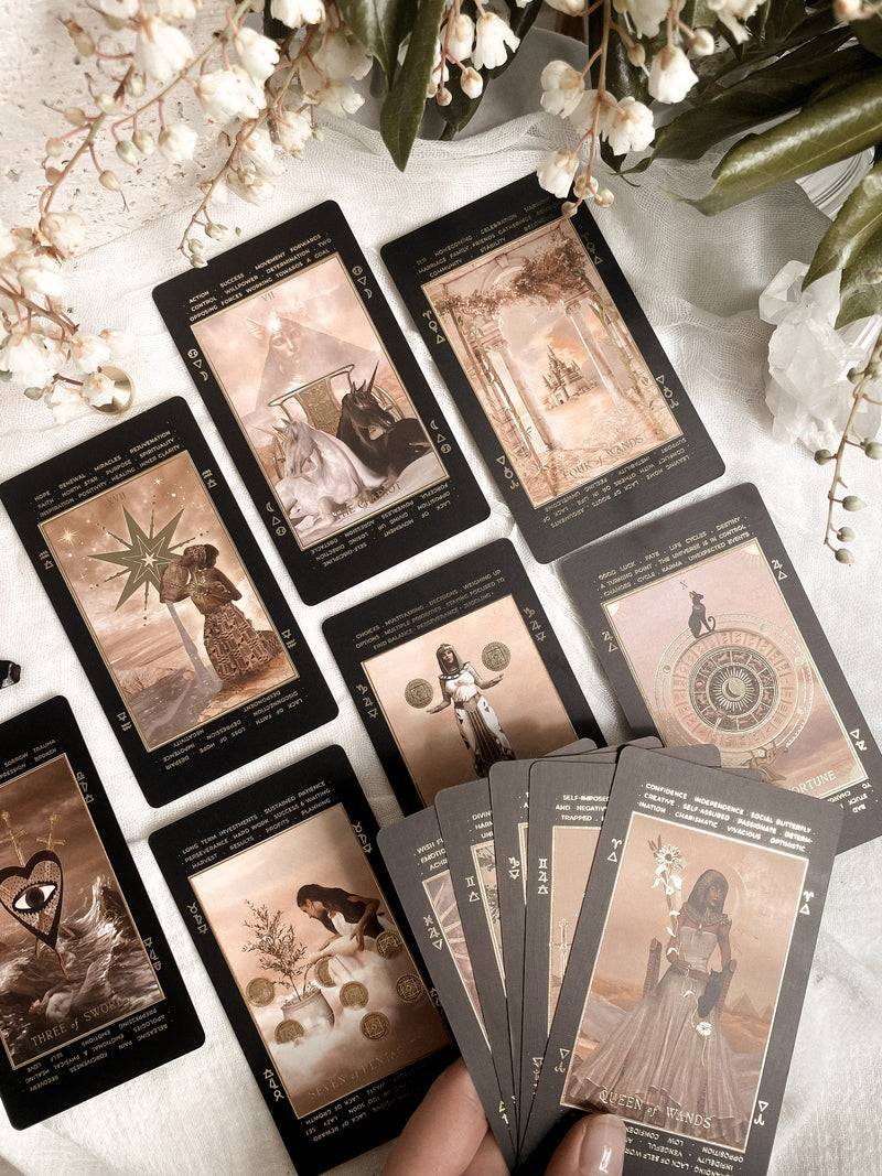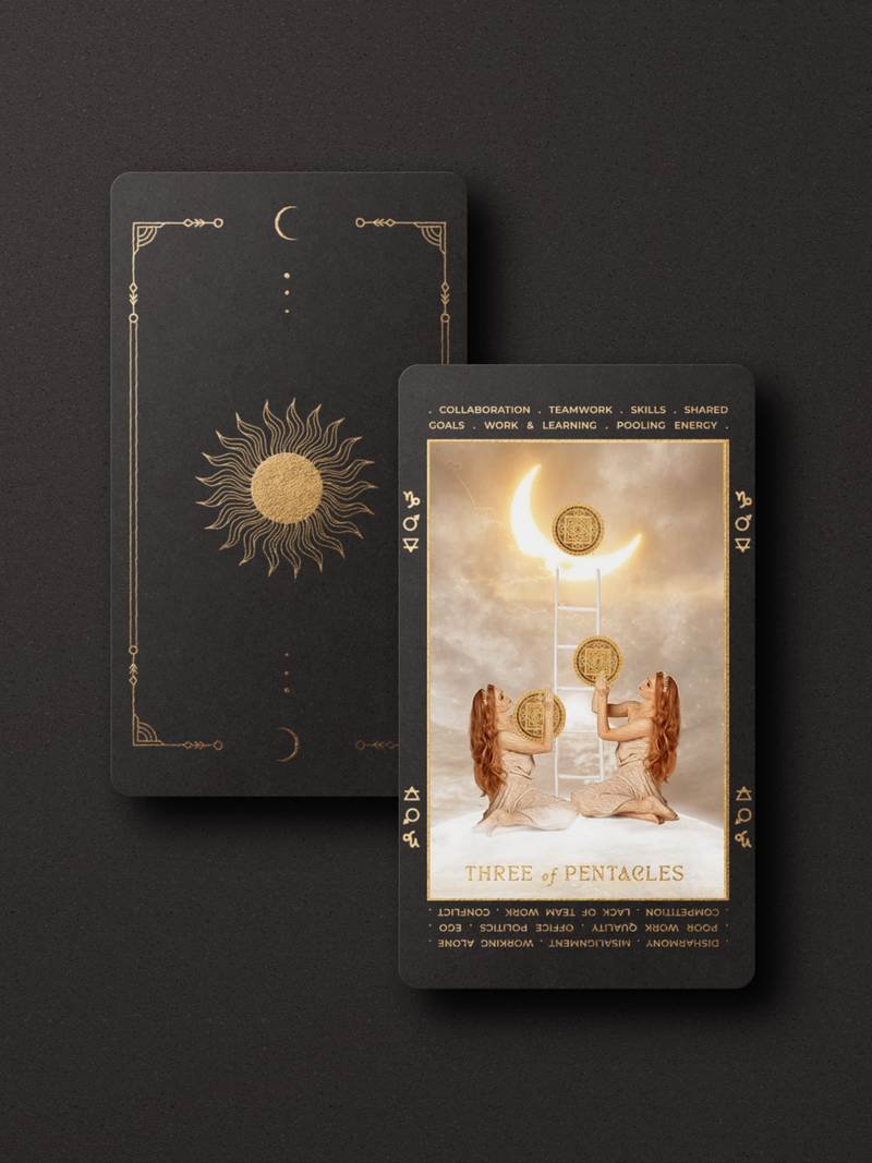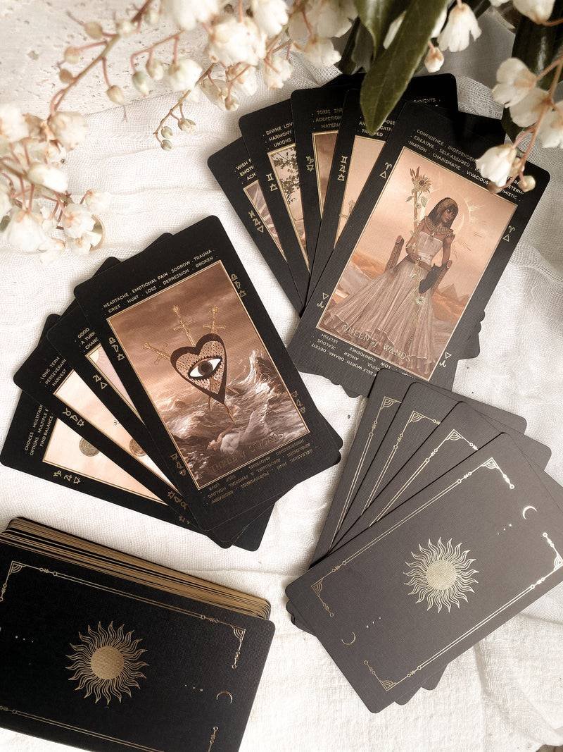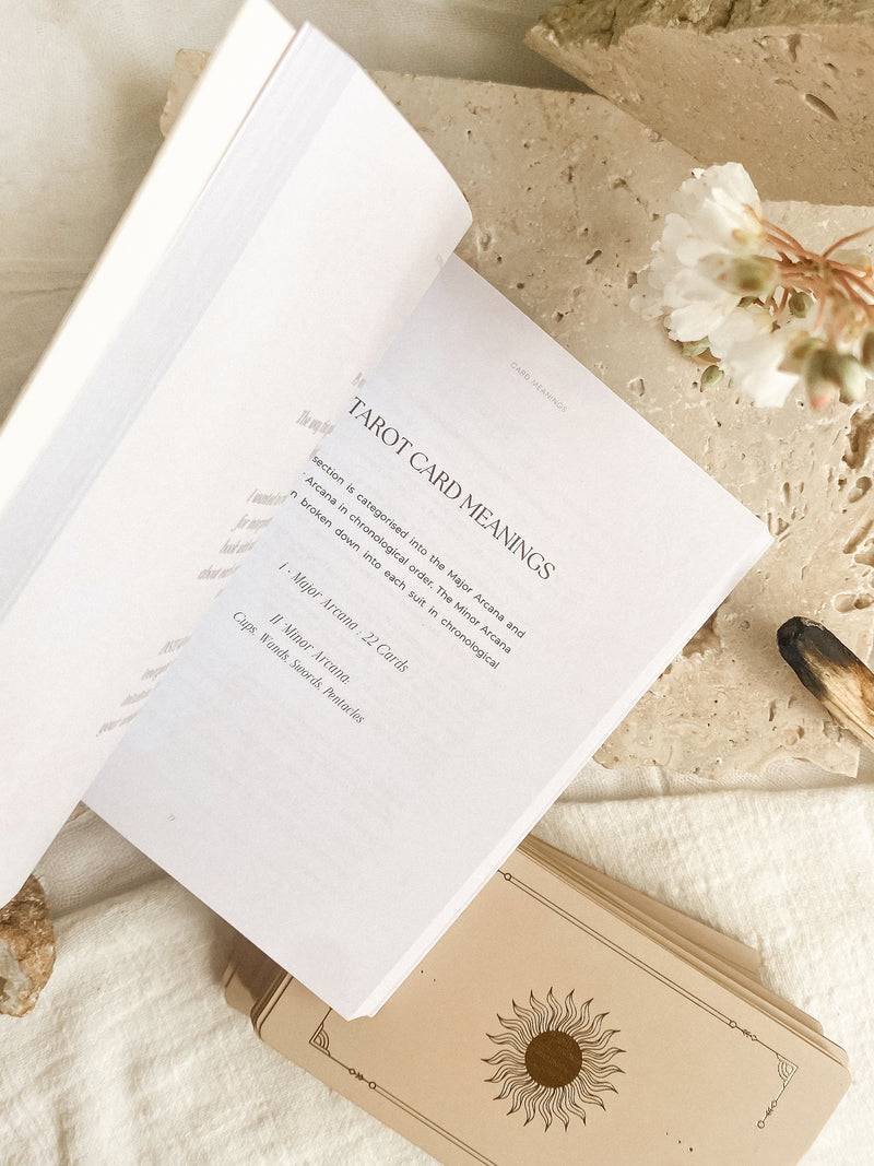The etheric artworks are celestial, dreamy collage-style creations of all 78 cards in the traditional Rider-Waite Tarot with a modern twist PLUS each card details astrological symbol, zodiac, elemental keys and KEYWORDS for both upright and reverse positions.