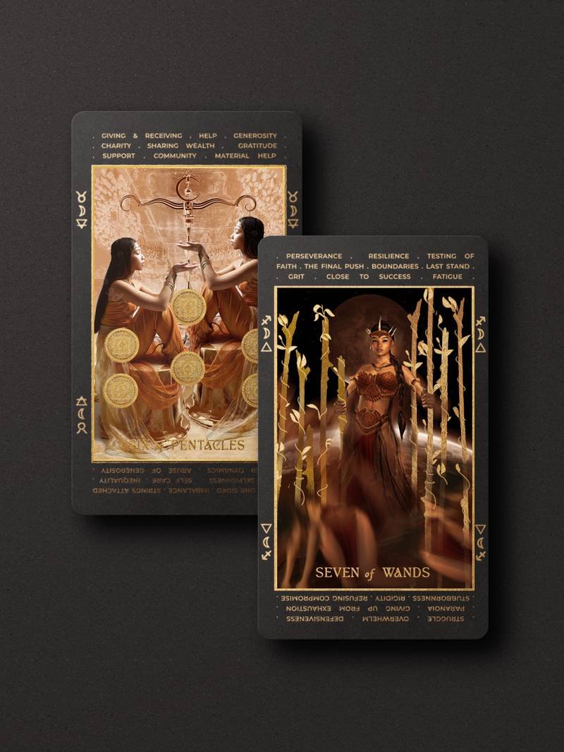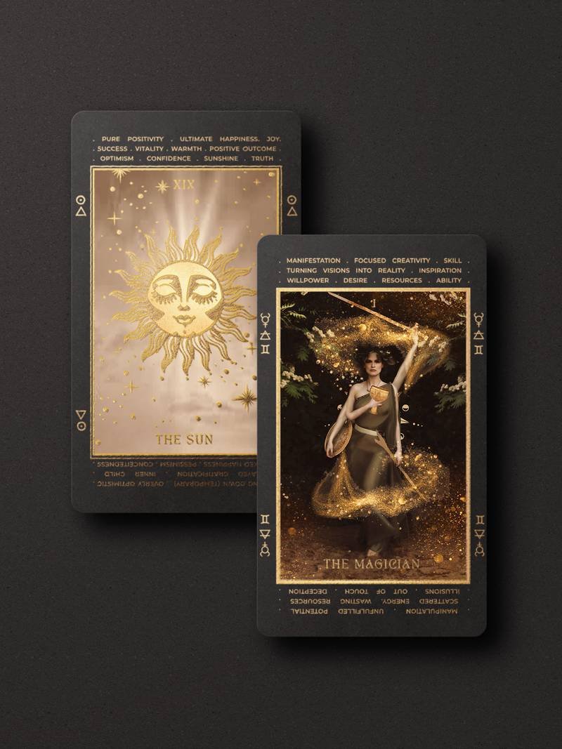 All Keywords are in gold foil. This deck is not recommended for those who may have visual difficulties. They are intentionally gold foiled and low-contrast to provide elusive prompts as they reflect the light, rather than bold text displaying all words in an easy-to-read format. This was intentionally crafted to assist and help with growing and developing intuition.