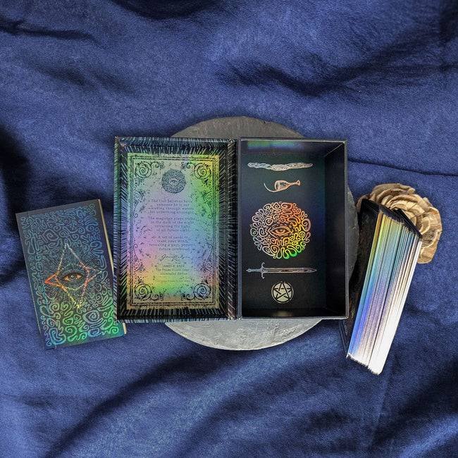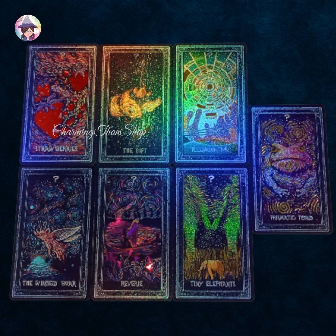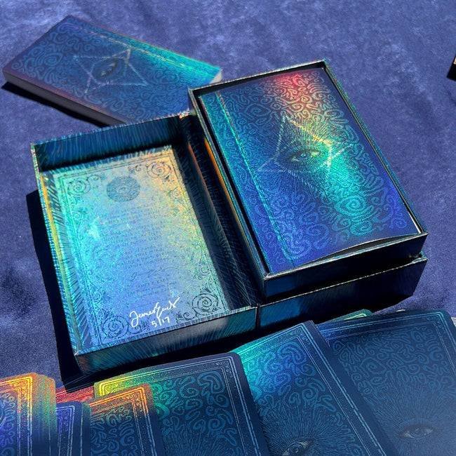 ***Each card has two foil colors on its face, prismatic silver foil titles, and is printed on an iridescent holographic paper with a rainbow luminous effect that changes color when touched by light.